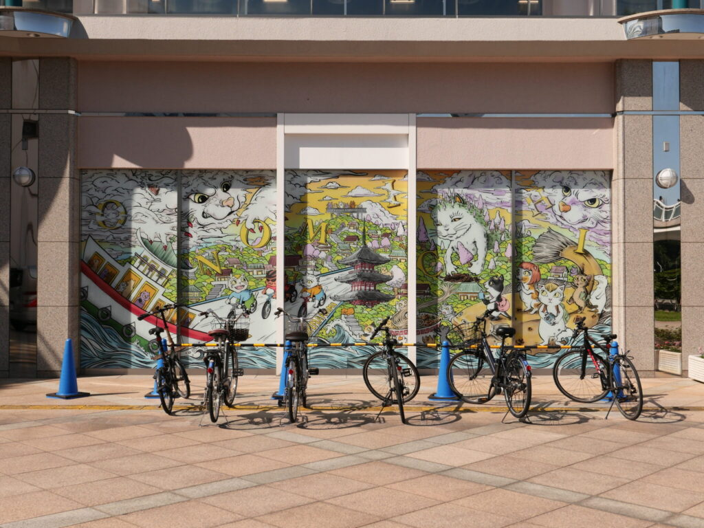 尾道駅前福屋跡地に開設された総合レンタルサイクルスペース「しまなみレンタサイクル」の店舗内から外へ向けてのガラス面にカッティングシートで尾道のフォトスポットとなりえるようなイラストをという依頼のもと、制作。