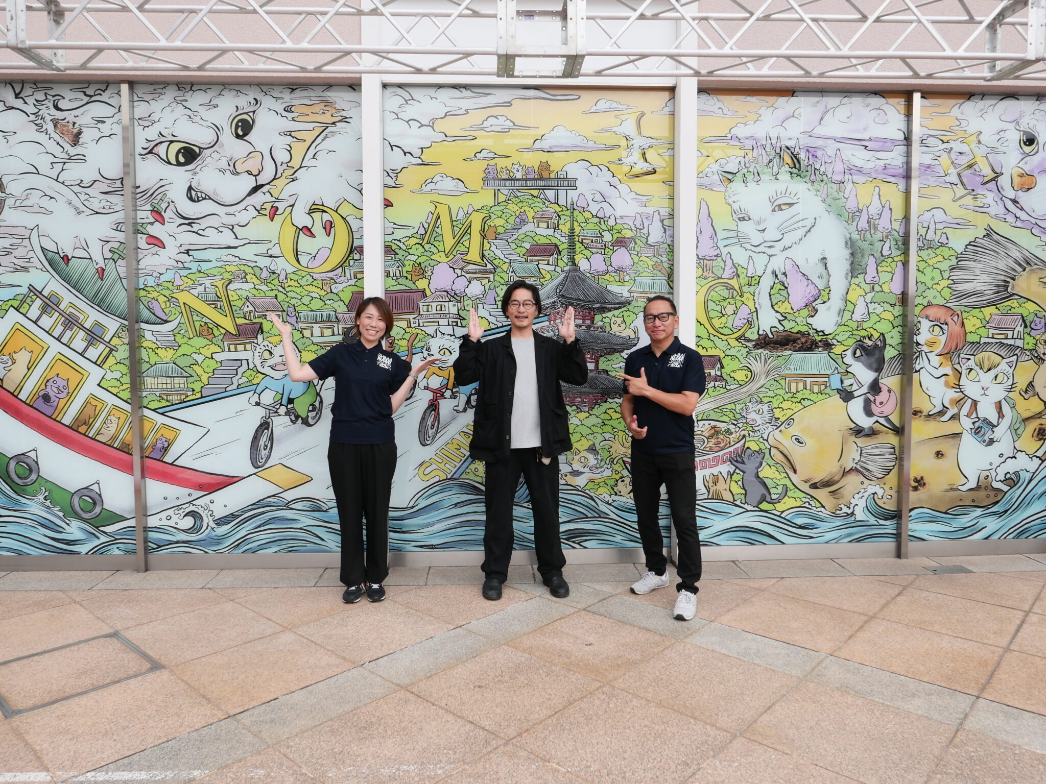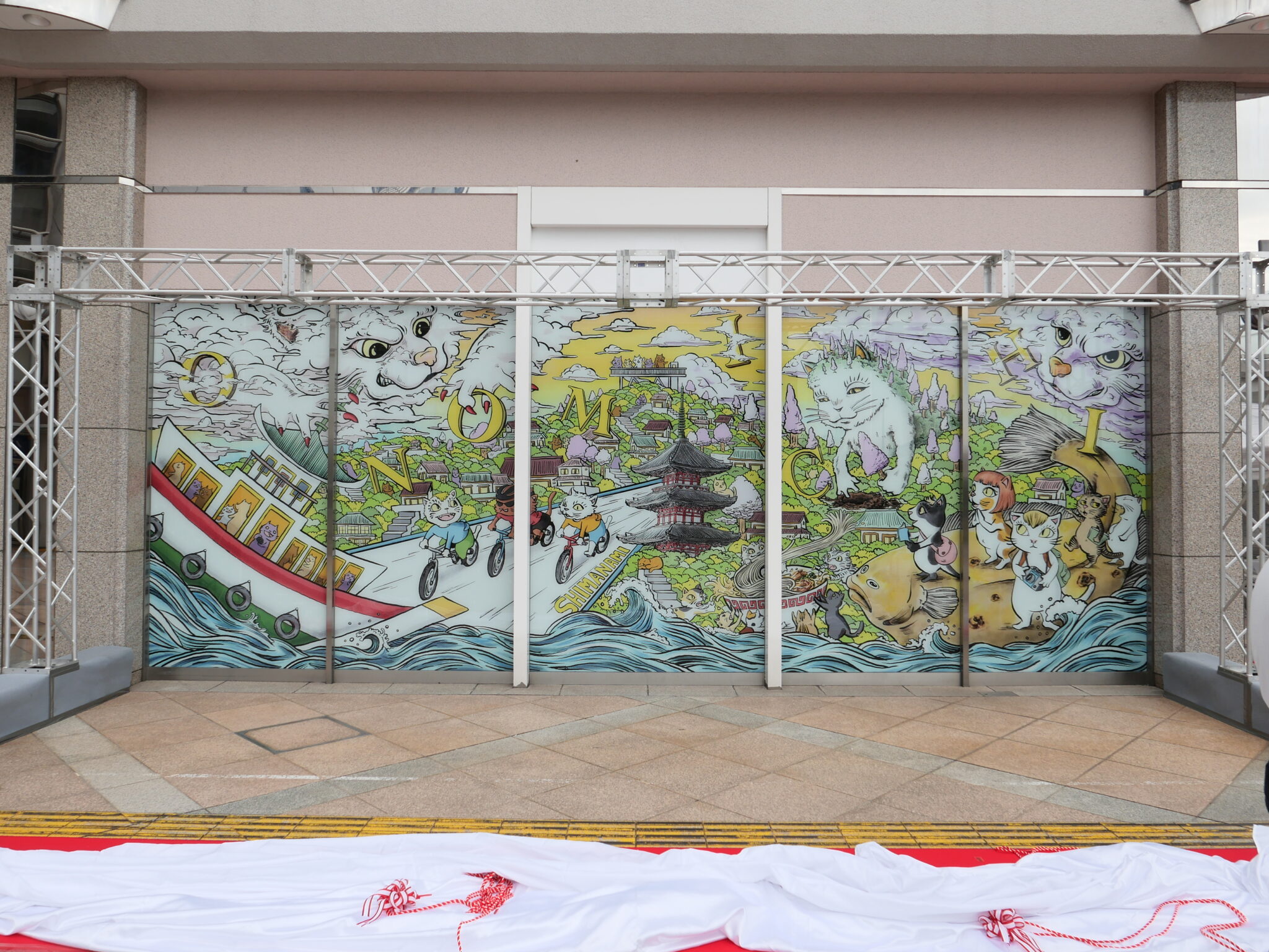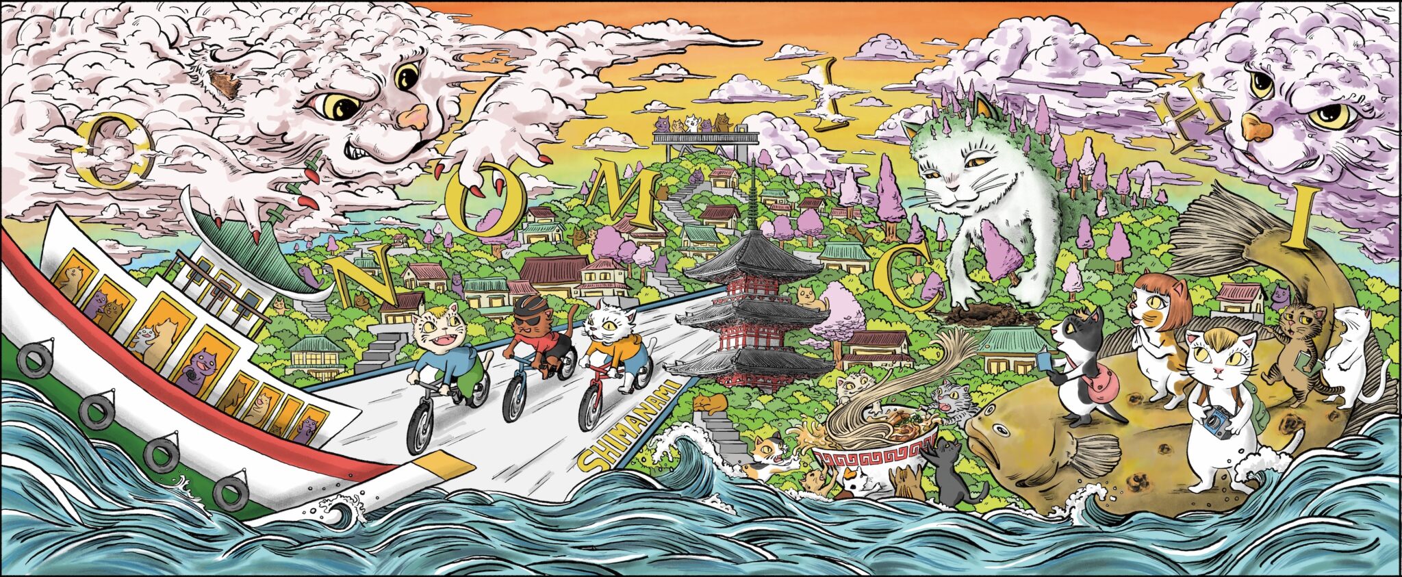 尾道を形どる自然界の神猫、尾道の市花である桜の木を植えてくれるシシガミ的な菩薩猫、観光する猫(持っているカメラはNECOH オートハーフ)、地域に住んでいる猫などたくさんの要素を詰め込みました。